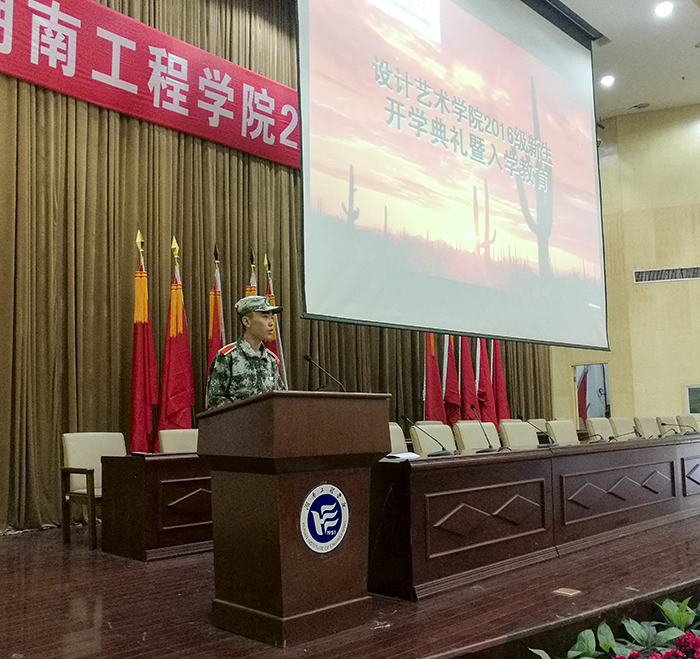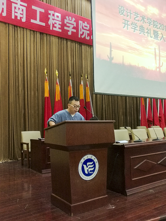 伴随嘹亮的国歌声,16级新生开学典礼拉开帷幕。院长段辉首先致辞,主要给新生介绍了应该以怎么样的一份责任和态度来对待大学生活,要珍惜自己的选择,珍惜四年时光,好好学习。接下来,现代设计研究所副主任冯亚星老师作为教师代表发言,根据艺术与设计专业诠释“工匠精神”,希望大家将品味与思考握在手心融在心里,通过四年的知识积累滋养技艺,提升心灵。在四年之后成为具有哲匠精神的新一代艺术设计大师。